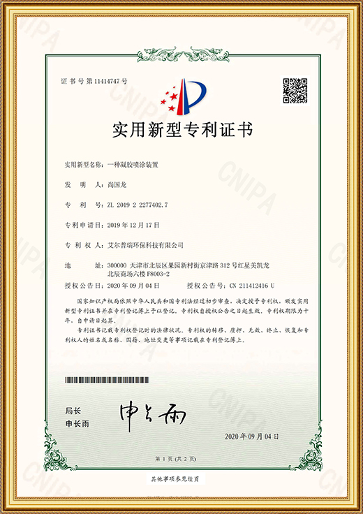 • 實用新型專利證書(一種凝膠噴涂裝置)